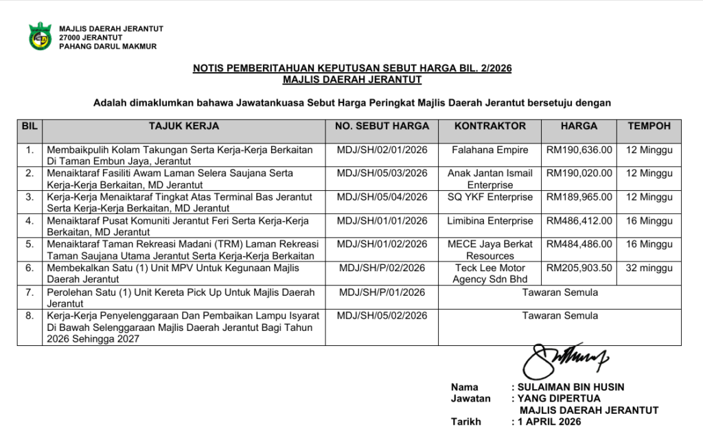 NOTIS PEMBERITAHUAN KEPUTUSAN SEBUT HARGA BIL. 2/2026 MAJLIS DAERAH JERANTUT