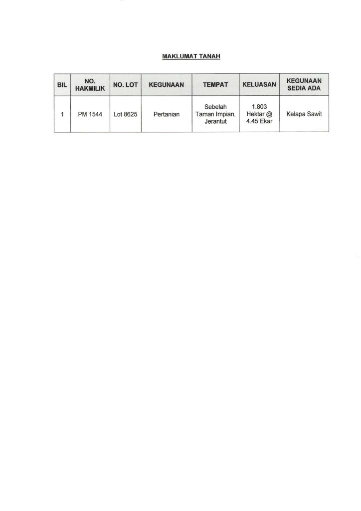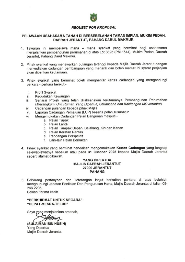 Majlis Daerah Jerantut (MDJ) mempelawa mana-mana syarikat yang berminat untuk mengemukakan cadangan usahasama pembangunan perumahan di atas Lot 8625 (PM 1544), Mukim Pedah, Daerah Jerantut, Pahang Darul Makmur.